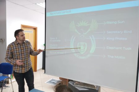 Radionicu Dječjih jezičnih igara o Južnoafričkoj Republici vodio je Joubert Loots. U uvodnom djelu prikazao je kratku prezentaciju o toj zemlji, kojom je učenike upoznao s geografskim obilježjima, ali i običajima, kulturom, gastronomijom te bitnim znanstvenicima i književnicima. Nakon prezentacije, učenici su naučili izgovarati pozdrave, lijepe riječi i brojeve, nakon čega su izrađivali tradicionalni glazbeni instrument i počastili se tradicionalnim slatkim kolačićem koji je za njih ispekao naš dragi gost!