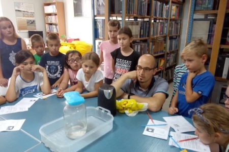 Ljeto u knjižnici nastavilo se radionicom o meteorologiji, a vodio ju je Antonio Stanešić. Okupilo se mnošvo djece željnih znanja o vremenu i vremenskim uvjetima. U uvodnom dijelu radionice voditelj je održao predavanje o meteorologiji i instrumentima koje koriste meteorolozi. Djeca su tako upoznala barometar, termometar, anemometar, vjetrulju i higromjer ili vlagometar.