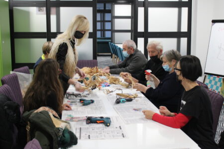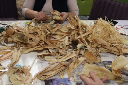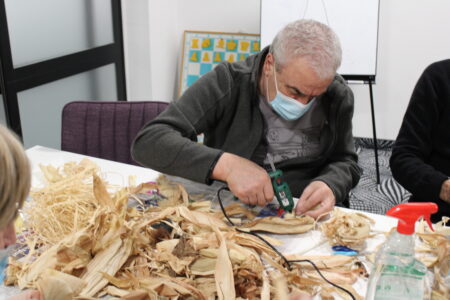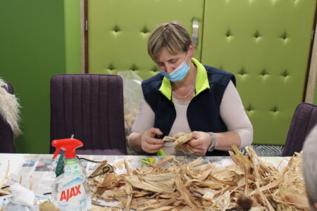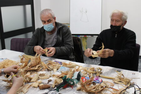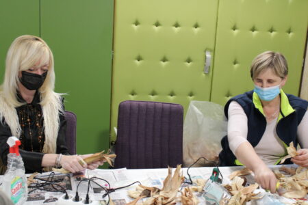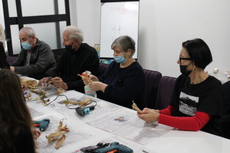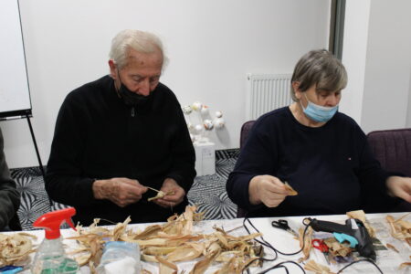 Voditeljice radionice, gđa. Marica Lacković i knjižničarka Sanja Lacković zajedno s članovima Gradskog društva osoba s invaliditetom izrađivale su anđele i mašne od „komušine“, suhih listova od kukuruza.